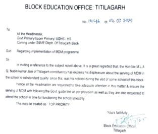 ଟିଟିଲାଗଡ,୦୪/୦୭/୨୦୨୫,(ଜେ.ଏନ୍.ଏସ୍.), ଟିଟିଲାଗଡ଼ ବ୍ଲକ ଅନ୍ତର୍ଗତ ବିଭିନ୍ନ ସ୍କୁଲରେ ଲାଗିରହିଥିବା ଆନୁଷଙ୍ଗିକ ବ୍ୟବସ୍ଥା ସହ ମଧ୍ୟାହ୍ନ ଭୋଜନ ସଜାଡ଼ିବା ନେଇ ବ୍ଲକ ଶିକ୍ଷା ଅଧିକାରୀ ସମସ୍ତ ପ୍ରଧାନ ଶିକ୍ଷକମାନଙ୍କୁ ନିର୍ଦ୍ଦେଶନାମା ଜାରି କରିଛନ୍ତି । ପ୍ରକାଶ ଯୋଗ୍ୟ ଯେ, ଇତି ମଧ୍ୟରେ ସ୍ଥାନୀୟ ବିଧାୟକ ନବୀନ ଜୈନ ଓ ଉପଜିଲ୍ଲାପାଳ ରେହାନ ଖତ୍ରୀଙ୍କ ସମେତ ବିଭାଗୀୟ ଅଧିକାରୀ ଗୁଲମି ଉଚ୍ଚ ବିଦ୍ୟାଳୟକୁ ଅତର୍କିତ ପରିଦର୍ଶନରେ ଯାଇଥିଲେ। ସେଠାରେ ମଧ୍ୟାହ୍ନ ଭୋଜନରେ ଅନିୟମିତତା, ଶିକ୍ଷକଙ୍କ ଅନୁପସ୍ଥିତି ସମେତ ଅସ୍ୱାସ୍ଥ୍ୟକର ପରିବେଶ ଦେଖିବାକୁ ପାଇଥିଲେ । ଏ ନେଇ ଶୁକ୍ରବାର ଗୋଷ୍ଠୀ ଶିକ୍ଷା ଅଧିକାରୀ ଆର୍ତ୍ତତ୍ରାଣ ରଥ ତାଙ୍କ କାର୍ଯ୍ୟାଳୟ ଚିଠି ସଂଖ୍ୟା – ୧୫୪୬/୨୦୨୫ ମାଧ୍ୟମରେ ବ୍ଲକ ଅନ୍ତର୍ଗତ ସମସ୍ତ ପ୍ରଧାନ ଶିକ୍ଷକଙ୍କୁ ପ୍ରାଥମିକତା ଆଧାରରେ ଅବ୍ୟବସ୍ଥା ଠିକ୍ କରିବାକୁ ନିର୍ଦ୍ଦେଶ ଦେଇଛନ୍ତି।
