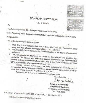 ବିଜେଡି ପ୍ରାର୍ଥୀଙ୍କ ମିଥ୍ୟା ସତ୍ୟପାଠ ଘଟଣା | ଟିଟିଲାଗଡ ନିର୍ବାଚନ ଅଧିକାରୀଙ୍କ ଠାରେ ଅଭିଯୋଗ କଲେ ସ୍ଵାଧୀନ ପ୍ରାର୍ଥୀ