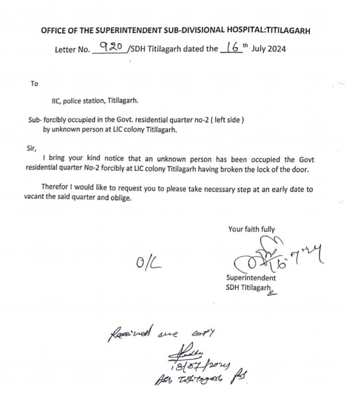ଟିଟିଲାଗଡ଼,୦୫.୦୪.୨୦୨୫(ଜେ.ଏନ୍.ଏସ୍.), ଟିଟିଲାଗଡ଼ ସରକାରୀ ଡାକ୍ତରଖାନାର କର୍ମଚାରୀଙ୍କ ପାଇଁ ଉଦ୍ଧିଷ୍ଟ ସରକାରୀ କ୍ୱାର୍ଟରର ତାଲା ଭାଙ୍ଗି ଦୀର୍ଘଦିନ ଧରି ଜବର ଦଖଲ କରାଯାଇଥିବା ନେଇ ଅଭିଯୋଗ ହୋଇଛି । ଘଟଣାକୁ ନେଇ ଡାକ୍ତରଖାନା କର୍ତ୍ତୃପକ୍ଷ ସ୍ଥାନୀୟ ଥାନାରେ ଲିଖିତ ଅଭିଯୋଗ କରିଥିଲେ ସୁଦ୍ଧା ପୁଲିସ ପକ୍ଷରୁ କୌଣସି ପଦକ୍ଷେପ ଗ୍ରହଣ କରାଯାଇ ନ ଥିବା ଅଭିଯୋଗ ହୋଇଛି । ସୂଚନା ଅନୁଯାୟୀ ସହରର ଏଲ୍.ଆଇ.ସି. କଲୋନୀ  କ୍ୱାର୍ଟର ନଂ -୨ରେ ରହୁଥିବା ଷ୍ଟାଫନର୍ସ ସୁଷମା ତନ୍ତୀଙ୍କ ବଲାଙ୍ଗିର ବଦଳି ହୋଇଥିଲା । ବଦଳି ପରେ ଶ୍ରୀମତୀ ତନ୍ତୀ ୧୦ ଅକ୍ଟୋବର ୨୦୨୩ରେ ସଂପୃକ୍ତ କ୍ୱାର୍ଟର କ୍ଳିଅରେନ୍ସ ବିଭାଗୀୟ କାର୍ଯ୍ୟାଳୟରେ ଦାଖଲ କରିଥିଲେ । ତେବେ କିଛିଦିନ ପରେ ଉକ୍ତ କ୍ୱାର୍ଟର ତାଲା ଭାଙ୍ଗି କେହି ଅଜଣା ବ୍ୟକ୍ତି ଜବରଦଖଲ କରିଥିବା ଡାକ୍ତରଖାନା କର୍ତ୍ତୃପକ୍ଷ ଜାଣିବାକୁ ପାଇ ବିଭାଗୀୟ ପତ୍ର ସଂଖ୍ୟା ୯୨୦/୧୬ ଜୁଲାଇ୨୦୨୪ ଅନ୍ତର୍ଗତ ଟିଟିଲାଗଡ଼ ଥାନାରେ ଲିଖିତ ଅଭିଯୋଗ କରିଥିଲେ ।ତେବେ ଦୀର୍ଘଦିନ ଧରି ଏହି କ୍ୱାର୍ଟର ଜବର ଦଖଲରେ ରହିଥିଲେ ସୁଦ୍ଧା କେବଳ ଏକ ଅଭିଯୋଗ କରି ଡାକ୍ତରଖାନା କର୍ତ୍ତୃପକ୍ଷ ଆଉ କୌଣସି ପଦକ୍ଷେପ ନ ନେବା ଜବରଦଖଲକାରୀଙ୍କ ମନୋବଳ ବୃଦ୍ଧି କରିବା ସଦୃଶ ହୋଇଛି । ବର୍ତ୍ତମାନ ଘଟଣାକୁ ନେଇ ଥାନା ଅଧିକାରୀ କଲ୍ୟାଣୀ ବେହେରା ସ୍ଥିତି ଅନୁଧ୍ୟାନ କରିବେ ବୋଲି କହିଥିବା ବେଳେ ବର୍ତ୍ତମାନ ଏସ୍. ଡି.ଏମ୍.ଓ. ଦାୟିତ୍ୱରେ ଥିବା ଡ଼. ଓମକାର ହୋତା ସଂପୃକ୍ତ କ୍ୱାର୍ଟର ଜବରଦଖଲ ମୁକ୍ତ କରାଇବାକୁ ସ୍ଥାନୀୟ ପୁଲିସକୁ ଆସନ୍ତାକାଲି ପୁଣି ଏକ ବିଭାଗୀୟ ଚିଠି ମାଧ୍ୟମରେ ଆବେଦନ କରାଯିବ ବୋଲି ସୂଚନା ଦେଇଛନ୍ତି । ପ୍ରକାଶ ଯୋଗ୍ୟ ଯେ ବିଭିନ୍ନ ବିଭାଗର ସରକାରୀ କର୍ମଚାରୀଙ୍କ ପାଇଁ ଉଦ୍ଧିଷ୍ଟ ଏହି ଏଲ୍.ଆଇ.ସି. କଲୋନୀର ଅନ୍ୟ କିଛି କ୍ୱାର୍ଟର ମଧ୍ୟ ଦୀର୍ଘଦିନ ଧରି ଜବରଦଖଲ ରହିଛି । ସଂପୃକ୍ତ ବିଭାଗୀୟ ଅଧିକାରୀମାନେ ଏହା ଉପରେ ଦୃଷ୍ଟି ଦେବାକୁ ବୁଦ୍ଧିଜୀବୀ ମହଲରେ ଦାବୀ ହୋଇଛି ।