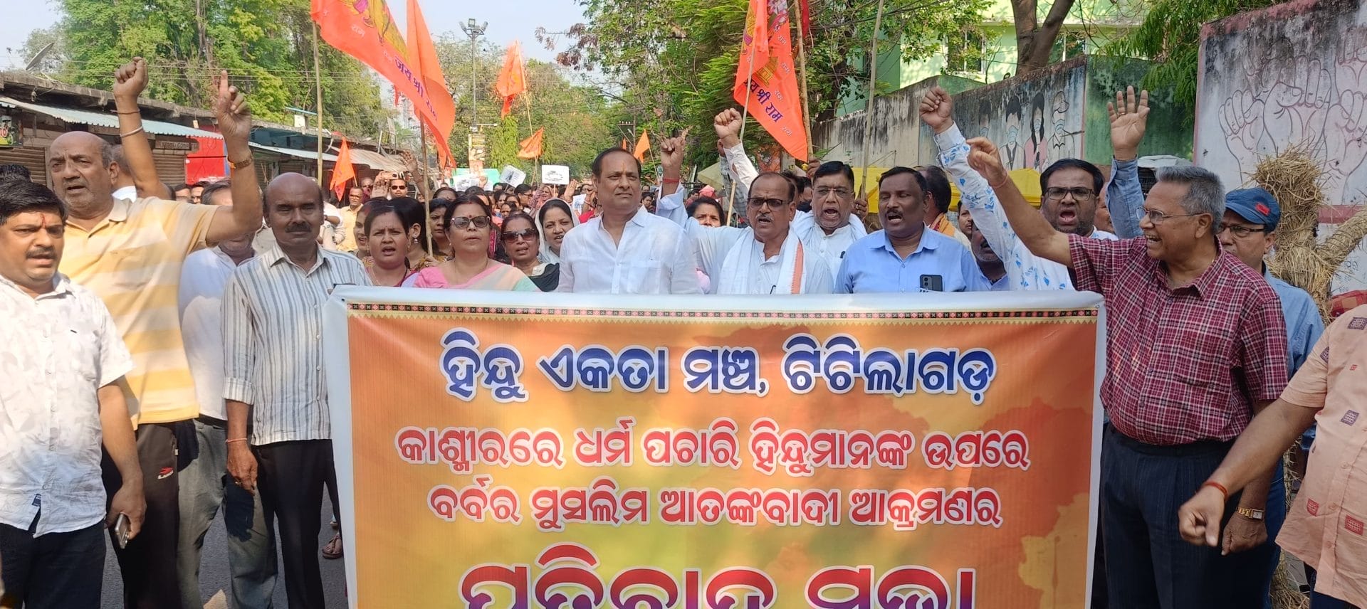 ଟିଟିଲାଗଡ଼,୨୭/୦୪/୨୦୨୫(ଜେ.ଏନ୍.ଏସ୍.) କାଶ୍ମୀର ପହଲଗାମରେ ହିନ୍ଦୁ ପର୍ଯ୍ୟଟକଙ୍କ ଉପରେ ଆତଙ୍କବାଦୀଙ୍କ ଦ୍ଵାରା ହୋଇଥିବା ବର୍ବରୋଚିତ ଆକ୍ରମଣ ପ୍ରତିବାଦରେ ସ୍ଥାନୀୟ ହିନ୍ଦୁ ଏକତା ମଞ୍ଚ ପକ୍ଷରୁ ବିକ୍ଷୋଭ ପ୍ରଦର୍ଶନ କରାଯାଇଛି । ମଞ୍ଚ ସଂଯୋଜକ ରାଜେଶ ବାବୁଙ୍କ ନେତୃତ୍ୱରେ ଶନିବାର ଏକ ବିଶାଳ ଶୋଭାଯାତ୍ରା ସ୍ଥାନୀୟ କଲ୍ୟାଣ ମଣ୍ଡପ ଠାରୁ ବାହାରି ଭାରତ ମାତା କି ଜୟ, ପାକିସ୍ଥାନ ମୁର୍ଦାବାଦ ଆଦି ନାରା ସହ ସହର ପରିକ୍ରମା କରି ଉପଜିଲ୍ଲାପାଳ କାର୍ଯ୍ୟାଳୟ ସମ୍ମୁଖରେ ପହଞ୍ଚିଥିଲା । ମଞ୍ଚ ପକ୍ଷରୁ ସେଠାରେ ଆତଙ୍କବାଦୀଙ୍କ କୁଶ ପୁତ୍ତଳିକା ଦାହ କରାଯିବା ସହ ରାଷ୍ଟ୍ରପତିଙ୍କ ଉଦ୍ଦେଶ୍ୟରେ ଏକ ଦାବୀ ପତ୍ର ଅତିରିକ୍ତ ତହସିଲଦାର ଆଦର୍ଶ ପ୍ରୀୟଦର୍ଶନୀ ବଳଙ୍କୁ ପ୍ରଦାନ କରାଯାଇଥିଲା ।କାର୍ଯ୍ୟକ୍ରମରେ ସ୍ଥାନୀୟ ବିଧାୟକ ନବିନ ଜୈନ, ଓକିଲ ସଂଘ ସଭାପତି ସଞ୍ଜୟ ବେହେରା, ପୌରାଧ୍ୟକ୍ଷା ମମତା ଜୈନ, ଆରଏସଏସ, ବିଶ୍ୱ ହିନ୍ଦୁ ପରିଷଦ, ଦୁର୍ଗା ବାହିନୀ, ବଜରଙ୍ଗ ଦଳ, ପତଞ୍ଜଳି ଯୋଗ ସମିତି ପ୍ରମୁଖ ବହୁ ସଙ୍ଗଠନର ପ୍ରତିନିଧି ସୁଦର୍ଶନ ଦାଶ, ସେବକ ଚରଣ ଦାଶ, କୃଷ୍ଣଚନ୍ଦ୍ର ବାବୁ, ଟିକେଲାଲ ବେହେରା, ଡମ୍ବରୁଧର କର୍ମୀ, ଈଶ୍ୱର ଚନ୍ଦ୍ର ଜୈନ, ମୋହନ ଲାଲ ଜୈନ, ଅରବିନ୍ଦ ପାଣିଗ୍ରାହୀ, ଲଳିତା ଲାଠ, ନନ୍ଦ ମହଲା, କ୍ଷୀରସିନ୍ଧୁ ସାହୁ, ଚିତ୍ତରଞ୍ଜନ ସାହୁ, ଲାଦେବ ପ୍ରସାଦ ଗୁପ୍ତା, ଦିଲୀପ ସାହୁ, ସନ୍ତୋଷ ମେହେର, ପ୍ରମୋଦ ଡୋଡ଼କା, କୈଳାସ ସୋନି, ବିଷ୍ଣୁ ସାହୁ, ତୀରଥ ସିଂ ଠାକୁର, ତନୟ ଠାକୁର, ଅଶୋକ ବଗର୍ତ୍ତୀ,  ନିରୁପମା ସ୍ୱାଇଁ, ଅହଲ୍ୟା ଫରିକାର, ବର୍ଷା ରଣା, ସୁନିଲ ପଣ୍ଡା ପ୍ରମୁଖ ଉପସ୍ଥିତ ଥିଲେ ।