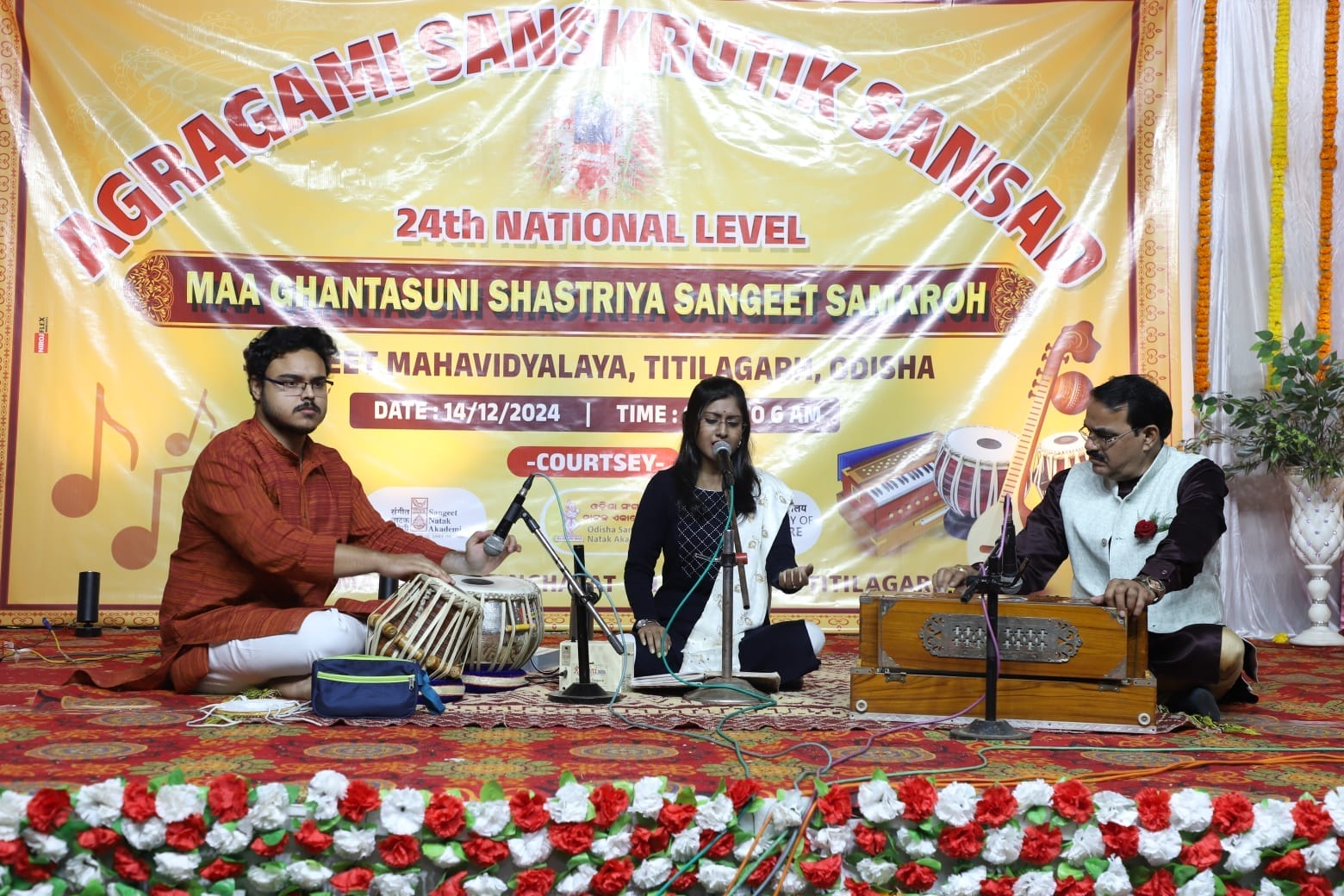 ଟିଟିଲାଗଡ଼ ଡିଏଭି କଲେଜର ପ୍ରାକ୍ତନ ଅଧ୍ୟକ୍ଷ ଡକ୍ଟର ଛୟାକାନ୍ତ ଷଡ଼ଙ୍ଗୀଙ୍କ ସଭାପତିତ୍ଵରେ ଆୟୋଜିତ ଏହି ସମାରୋହରେ ପ୍ରବୀଣ କୁମାର ଦାଶ ସଂପାଦକୀୟ ବିବରଣୀ ପାଠ କରିଥିଲେ । ଏହି ଅବସରରେ ବିଶିଷ୍ଟ ସଙ୍ଗୀତ ସାଧକ ଧନେଶ୍ଵର ଦାଶଙ୍କୁ ଡକ୍ଟର ପଞ୍ଚାନନ ମିଶ୍ର ସ୍ମୃତିସମ୍ମାନ ପ୍ରଦାନ କରାଯାଇଥିଲା । ଏହି ସମାରୋହରେ ଦେଶର ବିଭିନ୍ନ ପ୍ରାନ୍ତରୁ ବିଶିଷ୍ଟ କଣ୍ଠଶିଳ୍ପୀ ଡକ୍ଟର ତାପସ ଘୋଷ, ସନ୍ତୋଷ ଦାଶ, ଶ୍ରୀତମ ଘୋଷ, ଅମିତ ରଗ, ସଚ୍ଚିକାନ୍ତ ସାହୁ, ନିକୁଞ୍ଜ ବିହାରୀ ସାମଲ, ପ୍ରଦୀପ ପଣ୍ଡା, ଏଚ.ରାମ ଚରଣ, ଏମ. କାମେଶ, ଶୁଚିସ୍ମିତା ନନ୍ଦ, ଟି.ଏନ.ଚୈତନ, ମିତାଲି ଘୋଷ, ସୁମନ ଭଟ୍ଟାଚାର୍ଯ୍ୟ, ରଞ୍ଜନ ପଟ୍ଟନାୟକ ପ୍ରମୁଖଙ୍କ ସମେତ ୨୦ ଜଣ କଳାକାର ଅଂଶ ଗ୍ରହଣ କରିଥିଲେ । ସନ୍ଧ୍ୟା ୬ ଘଣ୍ଟାରୁ ସକାଳ ୬ ଘଣ୍ଟା ପର୍ଯ୍ୟନ୍ତ କାର୍ଯ୍ୟକ୍ରମ ଆୟୋଜିତ ହୋଇଥିବାବେଳେ ଅନୁଷ୍ଠାନର ସମସ୍ତ ସଦସ୍ୟ ଉପସ୍ଥିତ ଥିଲେ। Important: Unauthorized Copying Prohibited