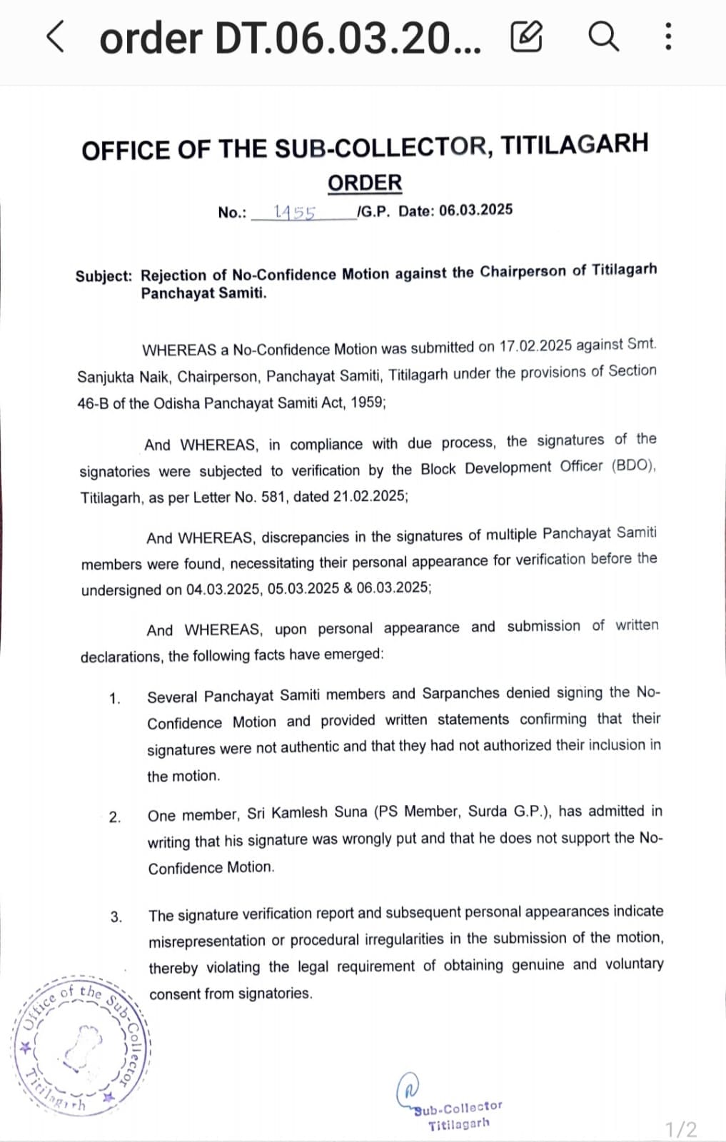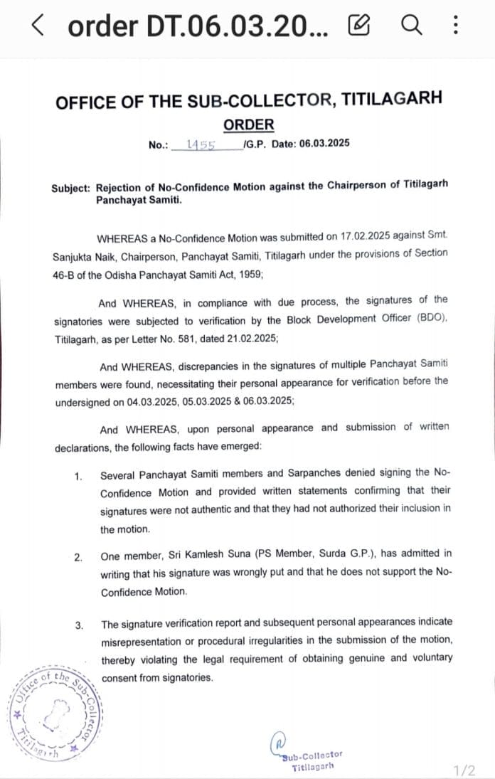 ଟିଟିଲାଗଡ ବ୍ଲକ ଅଧ୍ୟକ୍ଷାଙ୍କ ବିରୁଦ୍ଧରେ ଅନାସ୍ଥା ପ୍ରସ୍ତାବ ଉପଜିଲ୍ଲାପାଳଙ୍କ ଦ୍ଵାରା ଅଗ୍ରାହ୍ୟ