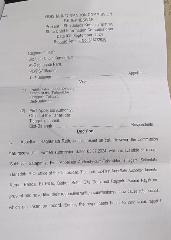 ଟିଟିଲାଗଡ଼,୨୪/୦୯,(ଜେଏନଏସ), ସୂଚନା ଅଧିକାର ଆଇନ ଅନୁଯାୟୀ ତଥ୍ୟ ପ୍ରଦାନରେ ବିଳମ୍ବ କୁ ନେଇ ରାଜ୍ୟ ସୂଚନା ଆୟୁକ୍ତ ଅସନ୍ତୋଷ ପ୍ରକାଶ ସହ ସଂପୃକ୍ତ ଅଧିକାରୀଙ୍କୁ ନୋଟିସ ଜାରି କରିଥିବା ସୂଚନା ମିଳିଛି । ସୂଚନା ଅନୁଯାୟୀ ସ୍ଥାନୀୟ ଆଇନଜୀବୀ ରଘୁନାଥ ରଥ ଆର ଟି ଆଇ ମାଧ୍ୟମରେ ୨୦୨୦ ମସିହାରେ ଟିଟିଲାଗଡ଼ ତହସିଲଦାରଙ୍କୁ ଏକ ତଥ୍ୟ ମାଗିଥିଲେ । ତେବେ ନିର୍ଦ୍ଧାରିତ ସମୟ ପରେ ମଧ୍ୟ ତଥ୍ୟ ପ୍ରଦାନ କରା ନ ଯିବାରୁ ଆବେଦନକାରୀ ରାଜ୍ୟ ସୂଚନା ଆୟୁକ୍ତଙ୍କ ଠାରେ ଅପିଲ କରିଥିଲେ । ମାନ୍ୟବର ଆୟୁକ୍ତ ତା ୦୩.୦୯.୨୦୨୪ ରେ ସଂପୃକ୍ତ ଅପିଲ ନଂ୩୧୬୭/୨୦୨୦ର ବିଚାରକରି ତତ୍କାଳୀନ ପି ଆର ଓ ଆନନ୍ଦ ପଣ୍ଡାଙ୍କୁ ଏଭଳି ଭୁଲର ପୁନରାବୃତ୍ତି ନ କରିବାକୁ ତାଗିଦ କରିଛନ୍ତି । ଏଥିସହ ପି ଆର ଓ ବିଭୂତି ସେଠ, ଗୀତା ଦୋରା ଓ ରାଜେନ୍ଦ୍ର କୁମାର ନାୟକଙ୍କ ବିରୁଦ୍ଧରେ ତଦନ୍ତକରି ୩ ମାସ ମଧ୍ୟରେ ଶୃଙ୍ଖଳାଗତ କାର୍ଯ୍ୟାନୁଷ୍ଠାନ ଗ୍ରହଣ କରିବାକୁ ଟିଟିଲାଗଡ଼ ଉପଜିଲ୍ଲାପାଳଙ୍କୁ ଆଦେଶ ଦେଇଛନ୍ତି । ସେହିପରି ଅନ୍ୟ ଏକ ଅନୁରୂପ ଘଟଣା ଅପିଲ ନଂ୩୧୭୦/୨୦୨୦ର ଶୁଣାଣି କରି ମାନ୍ୟବର ଆୟୁକ୍ତ ବଲାଙ୍ଗିରର ତତ୍କାଳୀନ ପି ଆର ଓ ପ୍ରିତମ କୁମାର ତାଣ୍ଡି ଓ ଶଙ୍କରଷଣ ପ୍ରଧାନଙ୍କ ବିରୁଦ୍ଧରେ ତଦନ୍ତ କରି ୩ ମାସ ମଧ୍ୟରେ କାର୍ଯ୍ୟାନୁଷ୍ଠାନ ଗ୍ରହଣ କରିବାକୁ ନିର୍ଦ୍ଦେଶ ଦେଇଛନ୍ତି ।